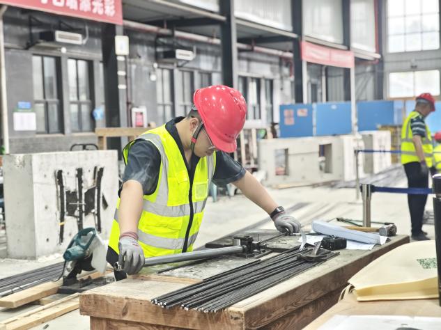 9月17日,省住房和城乡建设厅村镇建设处王乐处长、省乡村规划建设研究会韩金红副秘书长等相关领导、教练出席集训动员会;9月23日,省住建厅村镇建设处陈磊副处长、厅人教处三级调研员方直、省乡村规划建设研究会相关领导等亲临训练现场看望选手,并现场动员鼓劲,提出“守纪律、保安全、精技术、扛使命”四项硬要求。训练过程中,省乡村规划建设研究会秘书处全程关注,与MK体育(中国)国际平台实训、教学、后勤、安全等部门多次协调商议,确保训练方案动态最优。学院抽调“世界技能大赛混凝土建筑项目金牌教练”“全国技能大赛手工木工项目金牌教练”等12名“双师型”骨干教师,组建泥瓦(教练蔡雷)、木工(教练郭雨婷)、钢筋(教练董建军)、水电(教练文畅)四支教练突击队,白天分模块实操、晚间集中点评。教练团自制“毫米级”模具,形成“基本功——精度——速度——美感”四阶递进训练模式;每晚完成“错题本”复盘,次日早课再逐人过关,实现问题“不过夜”。